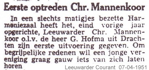 Verwarrend wordt het als er een nog eerder gedateerd berichtje opduikt op 01-05-1936. Hier wordt gesproken over een eerste optreden en wel van een koor genaamd “Christelijk Mannenkoor Leeuwarden-Huizum” met dezelfde dirigent.